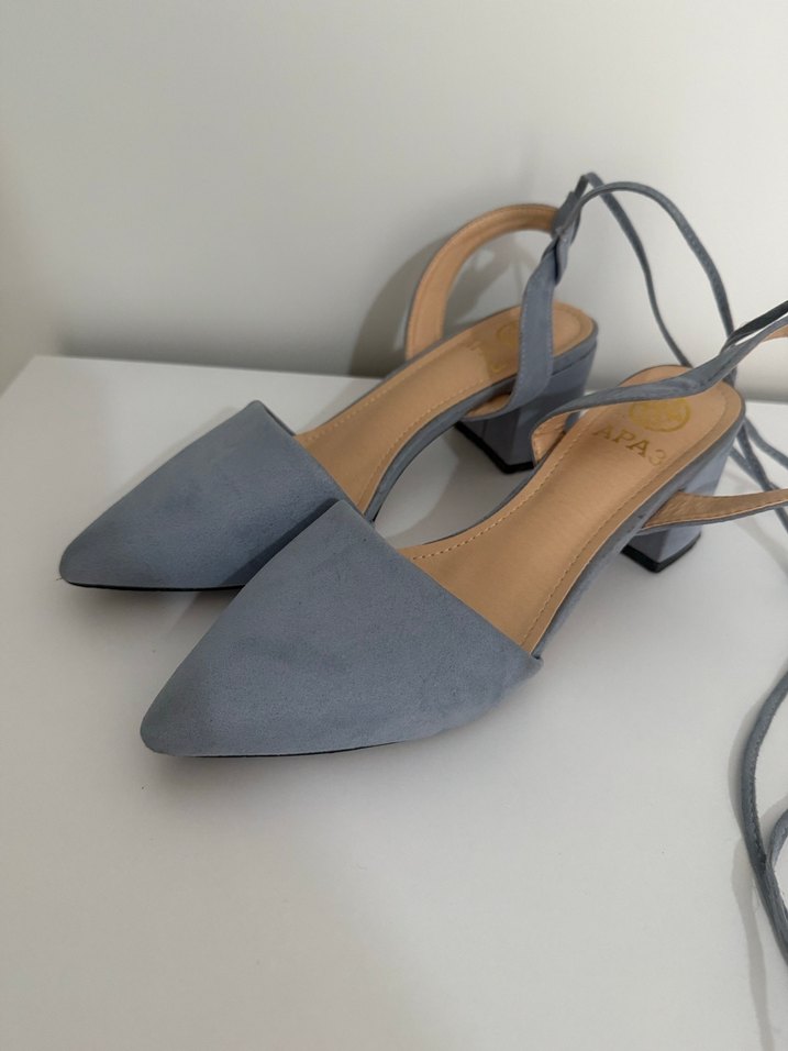 Mavi süet kadın topuklu ayakkabı, minimalist ve çağdaş tasarımlı, günlük kullanıma uygun.
