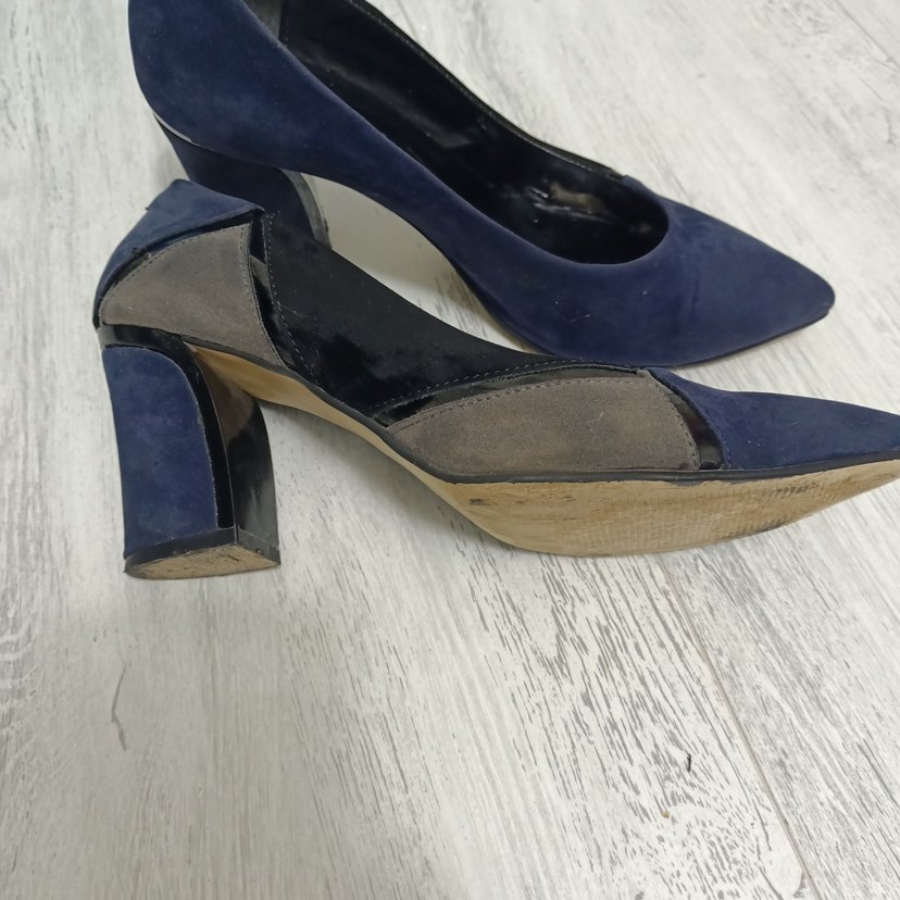 Mavi süet kadın stiletto, blok topuklu ve tokalı detaylı. Gri vurgulu, desen içermeyen, ofis için uygun çağdaş tarzda.