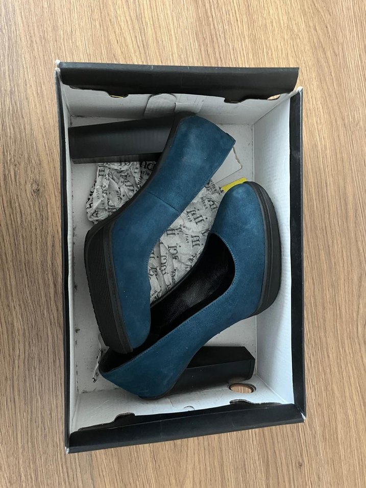 Mavi süet platform topuklu, tokalı, çağdaş tasarıma sahip kadın ayakkabısı, romantik akşamlar için uygun. 12 cm topuk