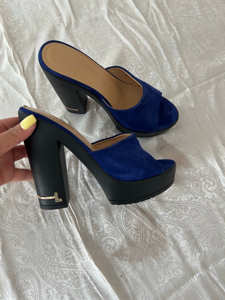 Parlak mavi süet üstü ve tokalı detaylı, sağlam siyah platform topuklu kadın terlik.