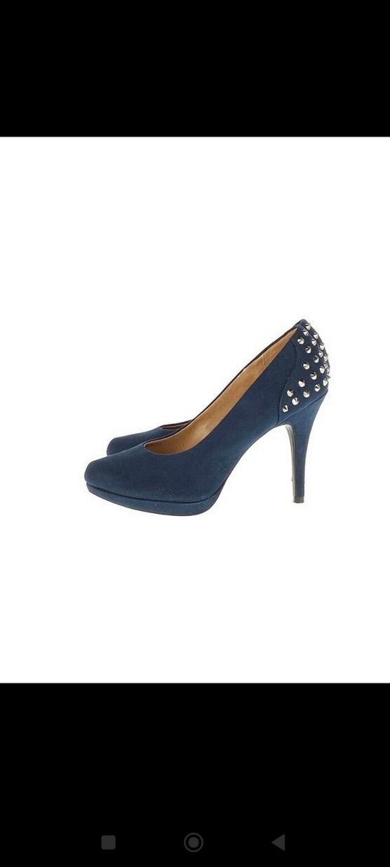 Mavi süet stiletto, yüksek topuklu ve parlak desenli, tokalı detaylara sahip. 1 defa kullanildi