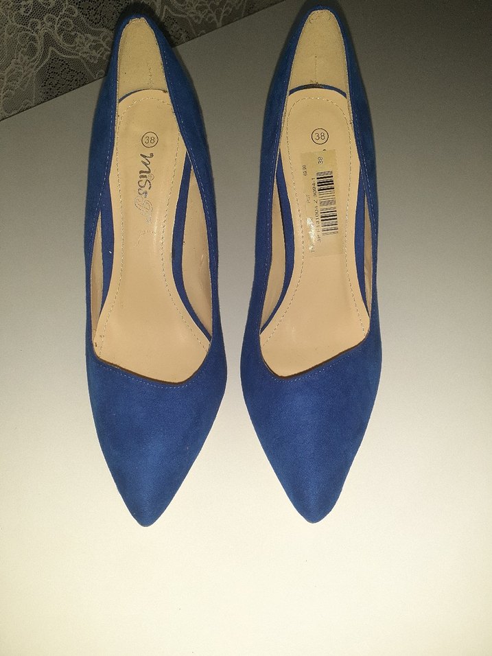 Mavi süet malzemeden yapılmış, parlak görünümlü, sivri burunlu ve minimalist tasarıma sahip Miss markalı stiletto. Romantik akşamlar için uygun.