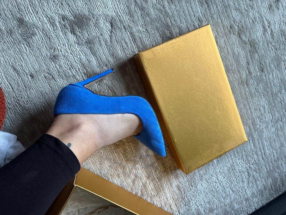 Mavi süet stiletto topuklu, tokalı detaylı, sivri burunlu ve yüksek topuklu kadın ayakkabısı. Minimalist ve çağdaş tasarım, günlük kullanım için uygun.