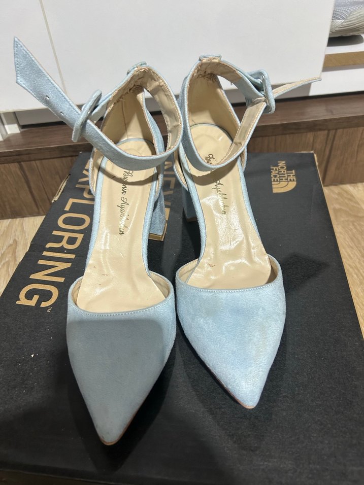Mavi süet, tokalı stiletto topuklu kadın abiye ayakkabı. Pastel tonlarda, bohem desenli ve düğünlere uygun. Üzerinde TLORING yazısı bulunur.