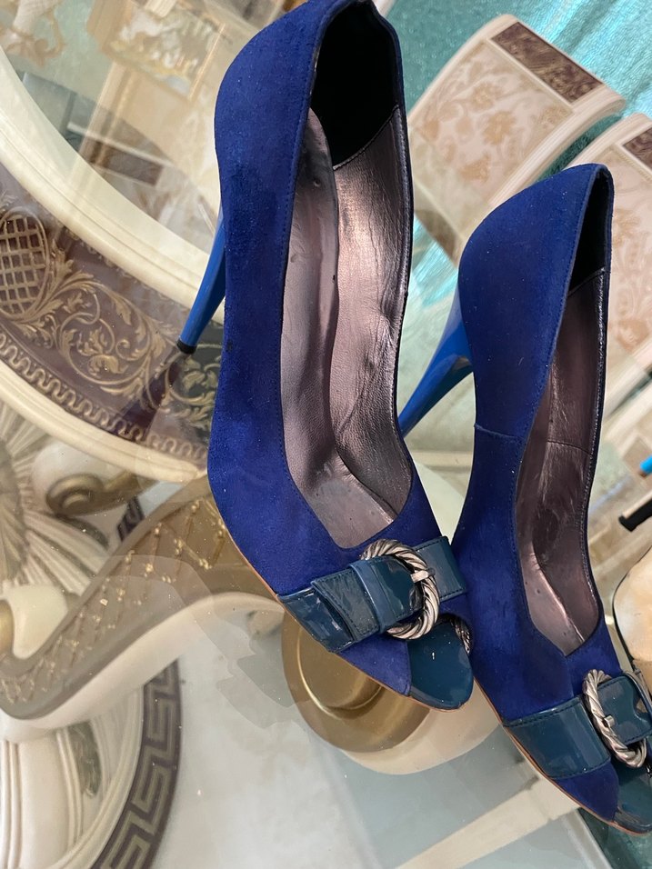 Mavi süet stilettolar, parlak yılan desenli ve tokalı detaylarla romantik akşamlar için çağdaş Paris tarzını yansıtıyor.