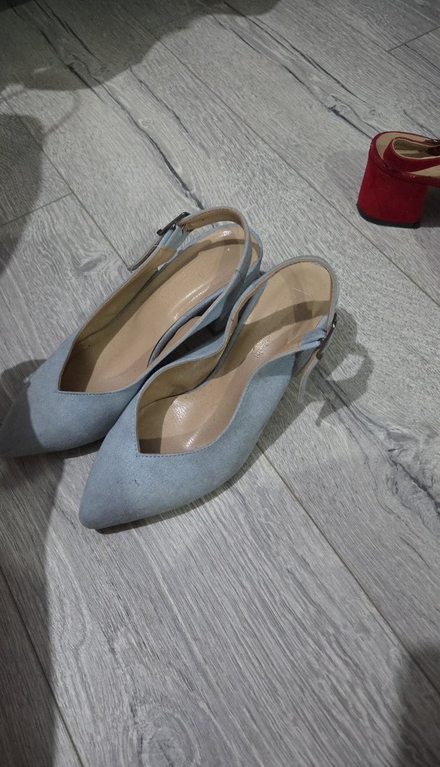 Mavi süet malzemeden yapılmış, topuklu ve tokalı kadın ayakkabısı. Minimalist ve normcore tarzıyla günlük kullanıma uygundur.