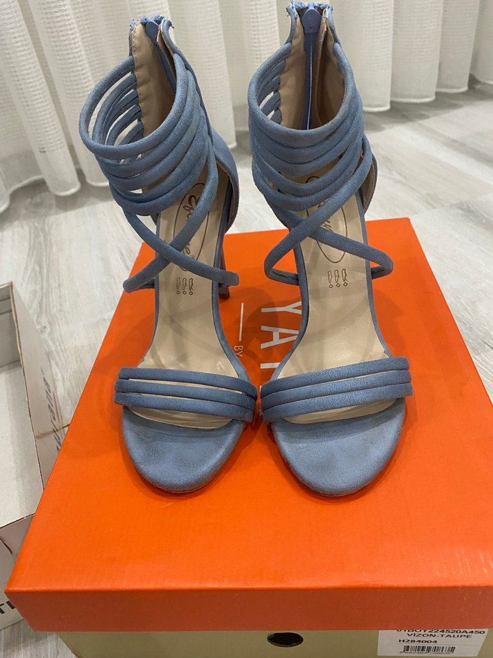 Mavi süet malzemeden, tokalı ve çoklu bantlı stiletto topuklu kadın ayakkabısıdır. Minimalist ve çağdaş tasarımı romantik akşamlar için uygundur.