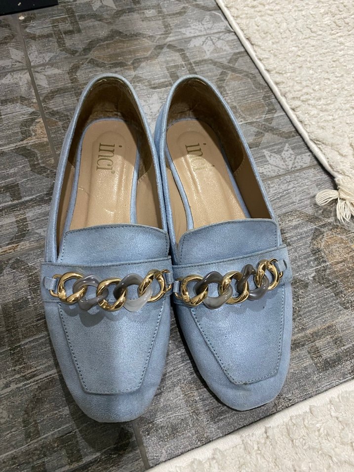 Pastel mavi süet babetler, blok topuk ve altın zincir detayına sahip. Normcore tarzıyla Paris etkisi sunar, günlük kullanım için uygun.
