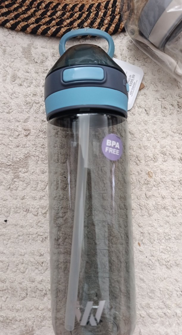 Gri kapaklı mavi suluk BPA içermez. Kolay içim için yerleşik pipet bulunur. kilitli kapak