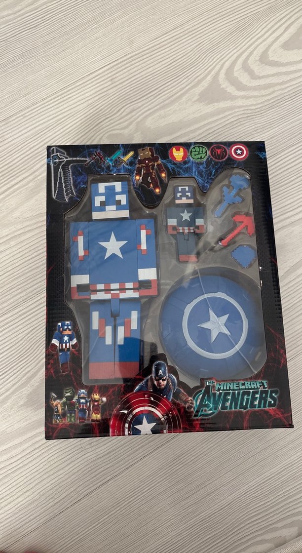 Koyu mavi renkte, yıldız amblemli büyük ve küçük aksiyon figürleri, kalkan ve üç aksesuar içeren süper kahraman seti. ♂️