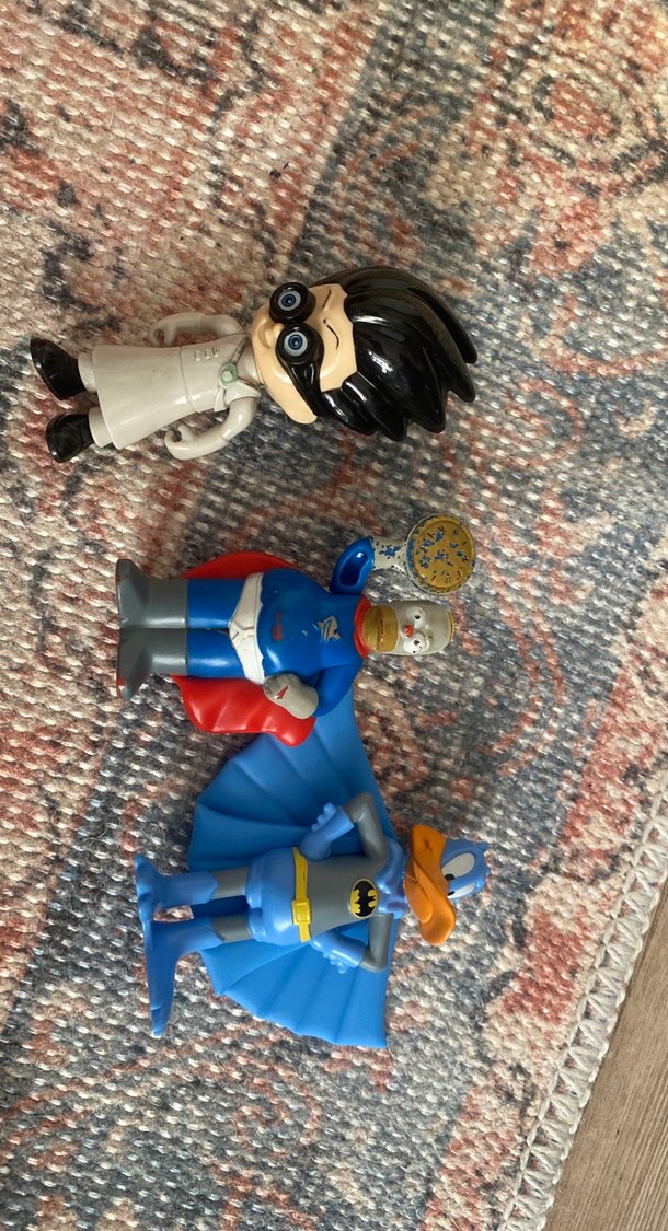 Mavi pelerinli süper kahraman, gözlüklü bilim insanı ve saatli karakterden oluşan üç figür. Her biri canlı renklere ve farklı detaylara sahip.