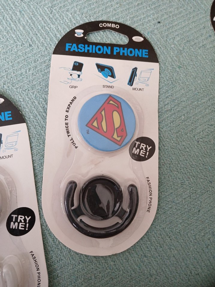 Renkli, mavi Süpermen logosu desenli telefon tutucu. Velcro kayış ile tutma, stand ve montaj özelliklerine sahiptir. Sokak stiline uygundur.