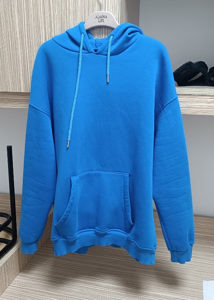 Mavi oversize sweatshirt cep kısmında fotoğraftaki gibi ufak birşey var S ile M beden arası herkese olur