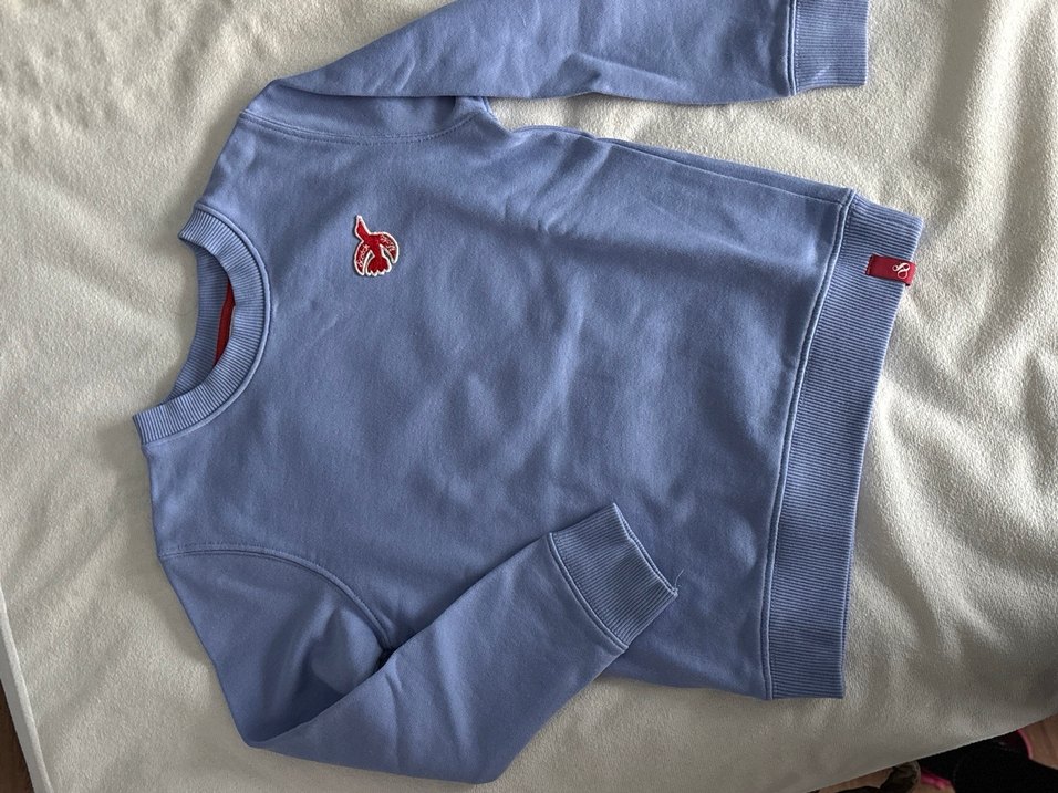 Mavi, bisiklet yakalı ve uzun kollu çocuk sweatshirtü, rahat kesime sahip. Yumuşak ve orta kalınlıkta kumaştan yapılmış, sade ve desensiz, göğsünde küçük kırmızı kuş detayı bulunur. Günlük kullanıma uygun, sokak tarzı rahatlığı sunar.