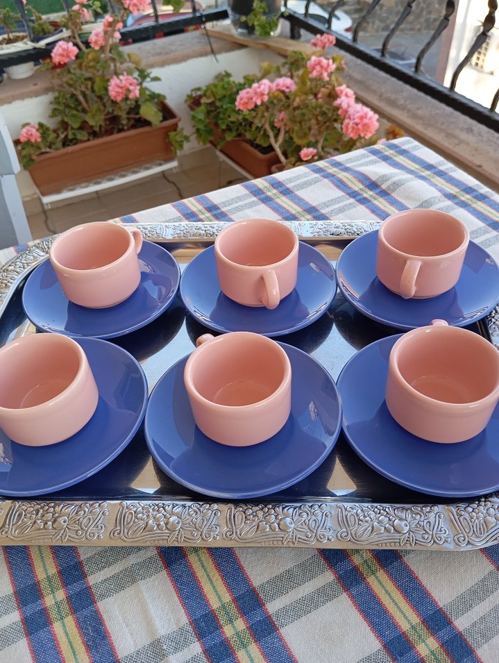 Pastel pembe fincanlar, canlı mavi tabaklarla birlikte dekoratif gümüş tepside. Altı adet fincan ve tabak seti, içecek servisi için uygun. ☕