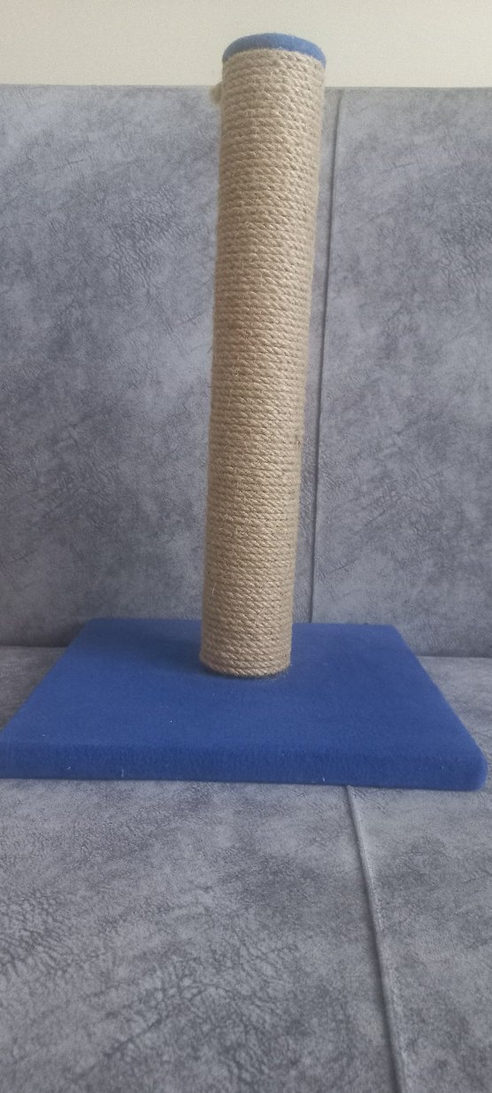 Mavi tabanlı ve doğal ip sarılı dikey direğe sahip kedi tırmalama direği.