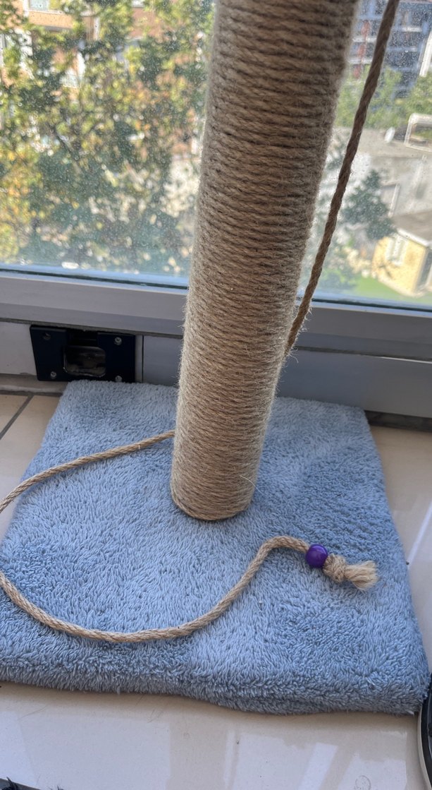 Mavi yumuşak tabanlı, halat kaplı tırmalama direği ve boncuklu ip oyuncaklı kedi aksesuarı. Kedim için almıştım ama maalesef hiç ilgisini çekmedi..