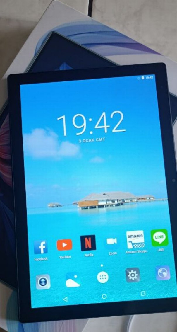 Facebook, YouTube, Netflix ve LINE uygulamaları bulunan mavi tablet. Dokunmatik ekranlı ve Wi-Fi bağlantılıdır. Ekranda 19:42 saati görünür. 16 gb 1tb