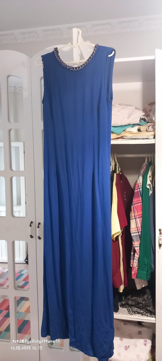 takı yakalı, kolsuz mavi uzun elbise, ofis kullanımı için uygun şık ve sade bir tasarıma sahiptir.