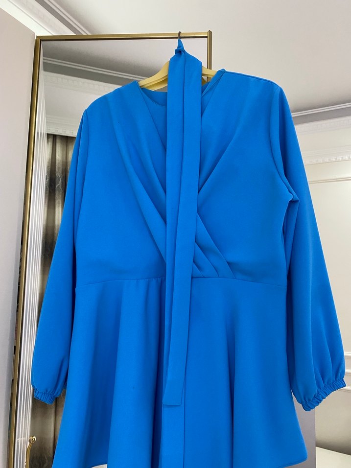 Canlı mavi renkte, V yakalı ve drapeli tasarıma sahip uzun kollu hamile bluzu. Regular kesim ve uzun boy, yumuşak sentetik kumaştan üretilmiştir, şık ofis kombinleri için uygundur.