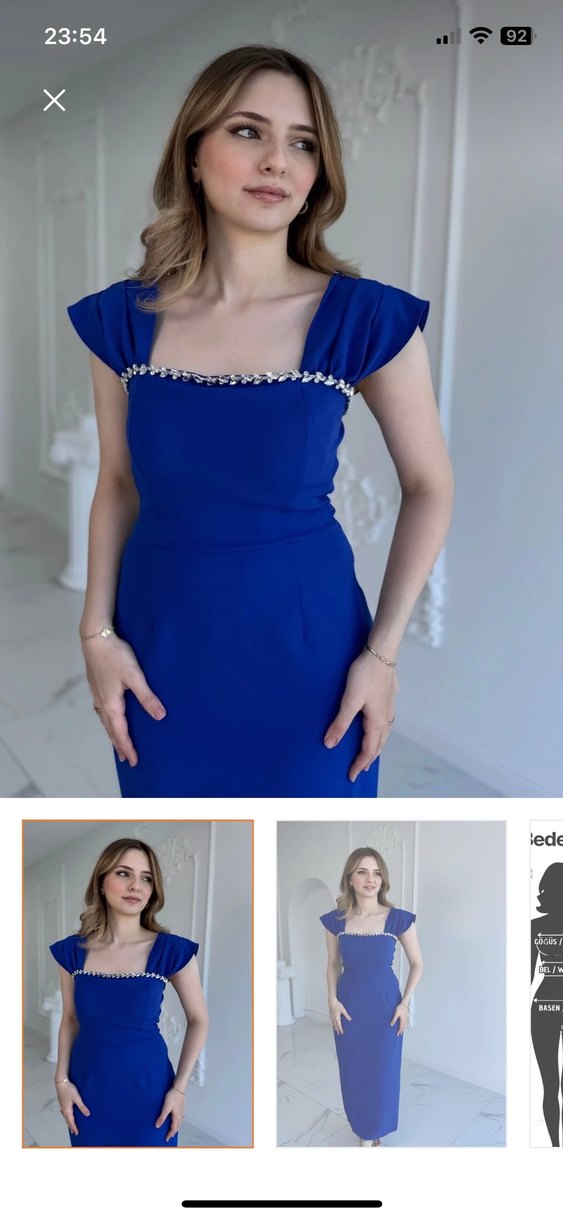 Bu mavi, beli oturan midi elbise, taş işlemeli ve kayık yaka detayıyla şık ve parlak bir görünüm sunar. Düğünler için uygundur. Yalnızca bir kere giyildi hiçbir defosu yok dolabı boşalttığım için uyguna satıyorum internet sayfasında 1100₺ yinede pazarlık yapabiliriz