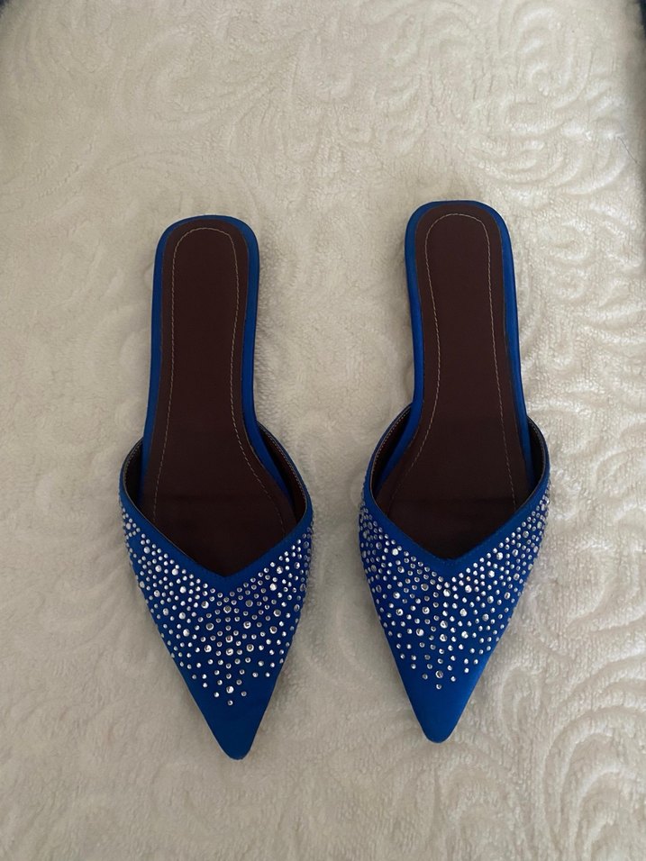 Mavi renkli, taş işlemeli stiletto topuklu terlikler, rahat kauçuk tabanlıdır ve günlük kullanım için uygundur. Sade ve çağdaş bir tarza sahiptir. Nişantaşı marka