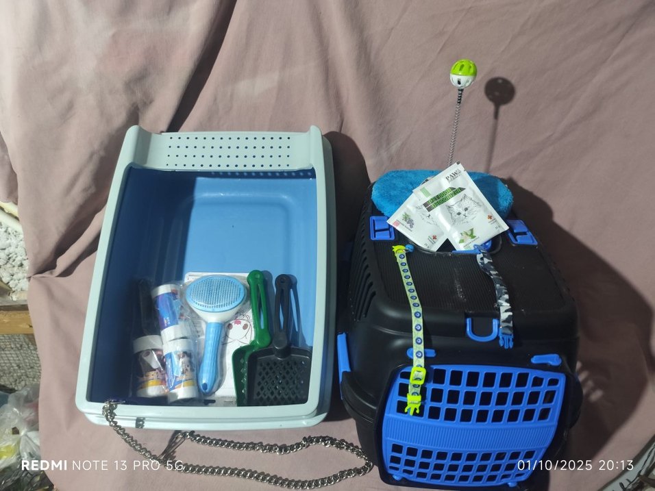 Mavi renkli havalandırmalı taşıma kabı ve gri renkli kedi tuvalet kabı, temizlik aparatları ve aksesuarlarla birlikte. tüm ekipman sıfır ürün