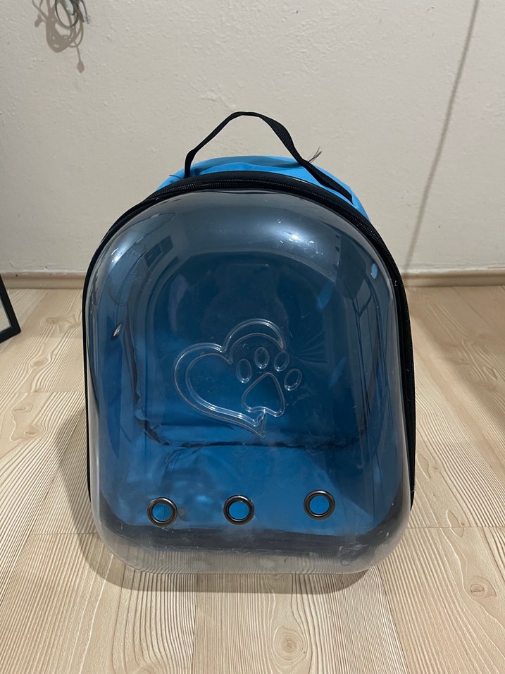 Koyu mavi renkte, önünde şeffaf ve havalandırma delikleri bulunan, pati deseni işlenmiş taşınabilir evcil hayvan sırt çantası. Üstünde taşıma kulpu vardır.