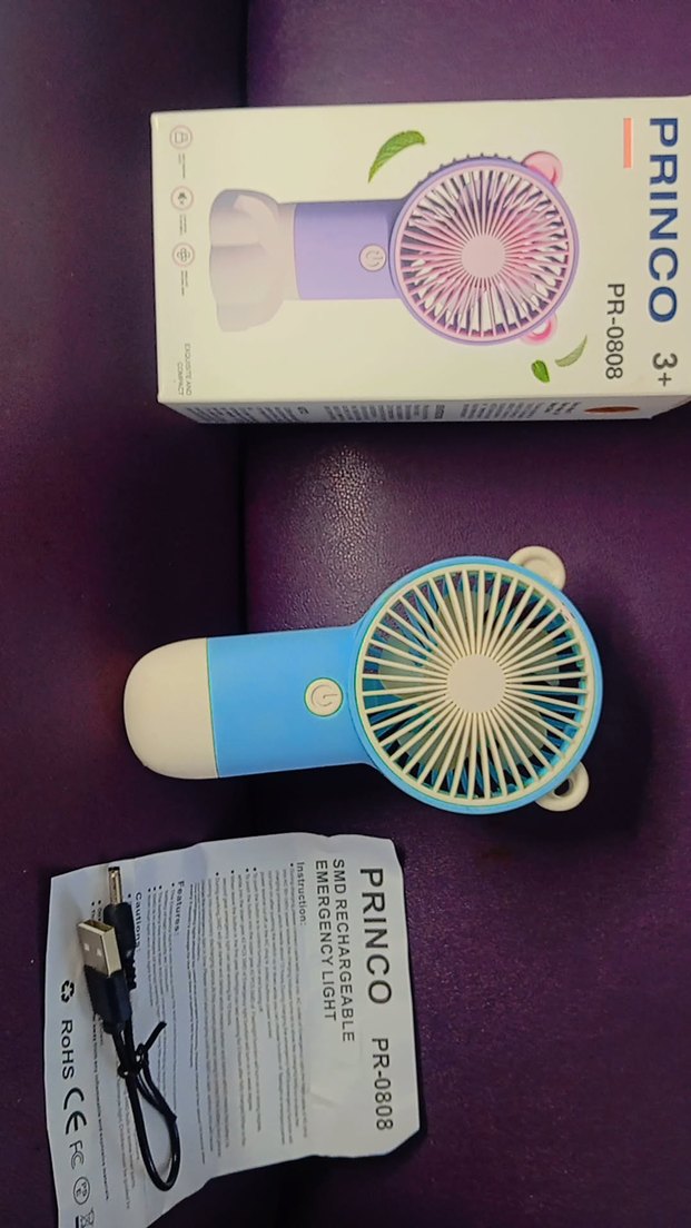 PR-0808 model mavi mini vantilatör, USB şarj ve küçük LED ışık ile taşınabilir ve renkli tasarıma sahiptir. ️