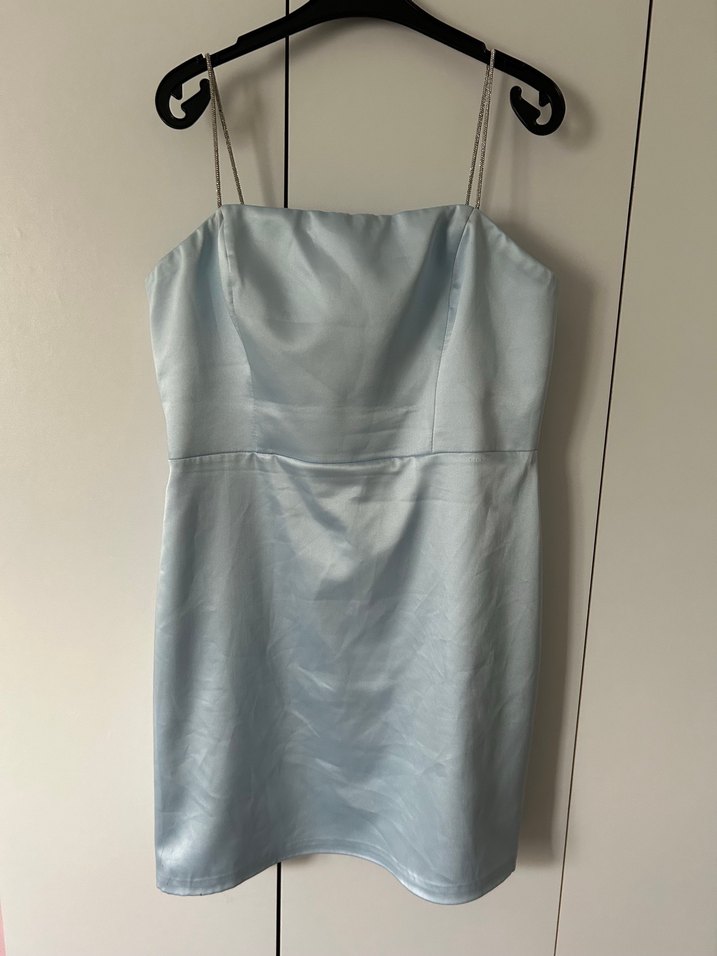 İnce askılı,parlak mavi renkte, vücuda oturan mini uzunlukta elbise. Saten kumaş. Sadece bir kere giydim. Sondaki iki leke astarında dolayısıyla elbiseyi etkilemiyor. Lekeleri aldığımsa vardı fakat giyeceğim gün fark ettiğim için iade etmemiştim. L bedene de uyar.