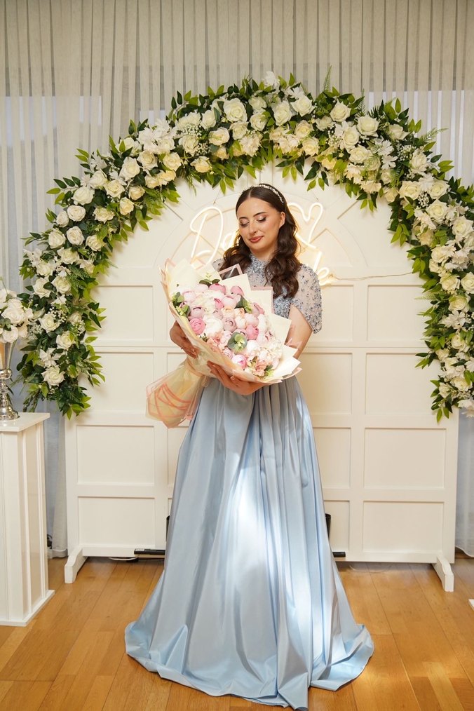 Pastel mavi renkte, straplez yaka ve kısa kollu uzun elbise. Bol kesim, drapeli ve çiçek desenli, şık bir düğün görünümü için ideal. Nışanımda giydim