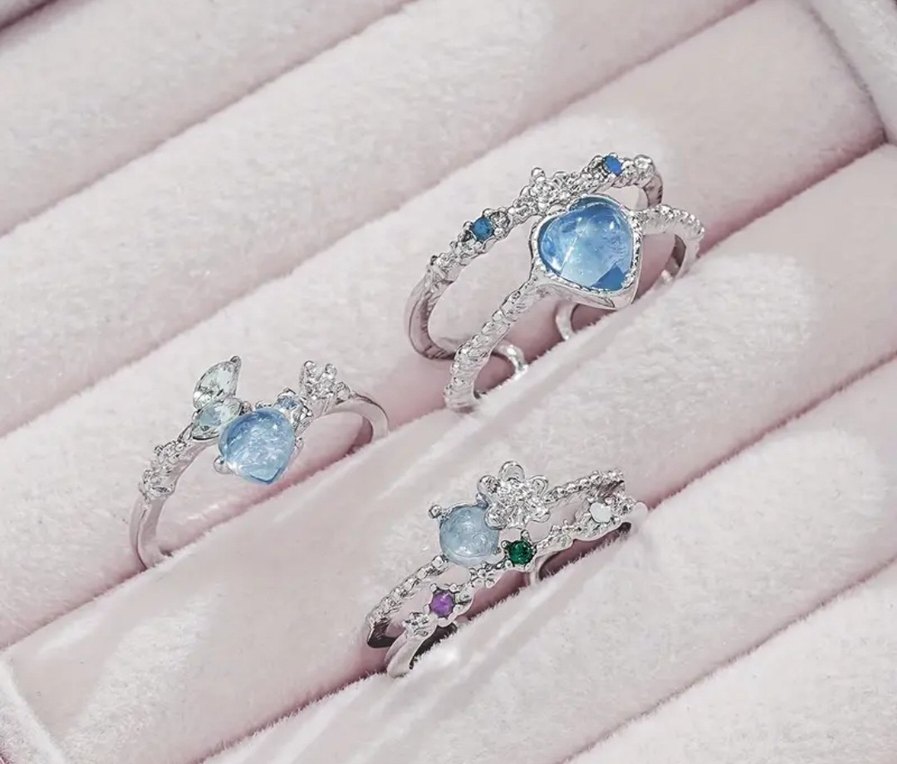 Mavi taşlı, işlemeli ve payet detaylı bohem tarzda kadın yüzükleri, uygun şık bir seçim.