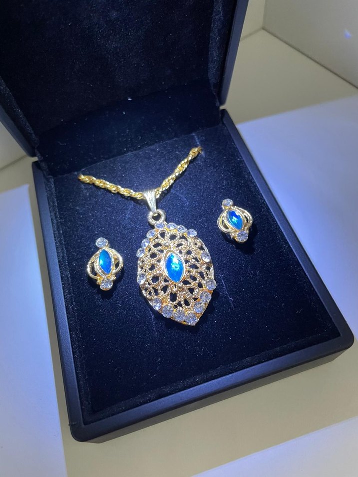 Kadınlar için altın renkli zincir, işlemeli ve payetli mavi taşlı kolye ucu ve uyumlu küpelerden oluşan takı seti, düğünler için uygundur.