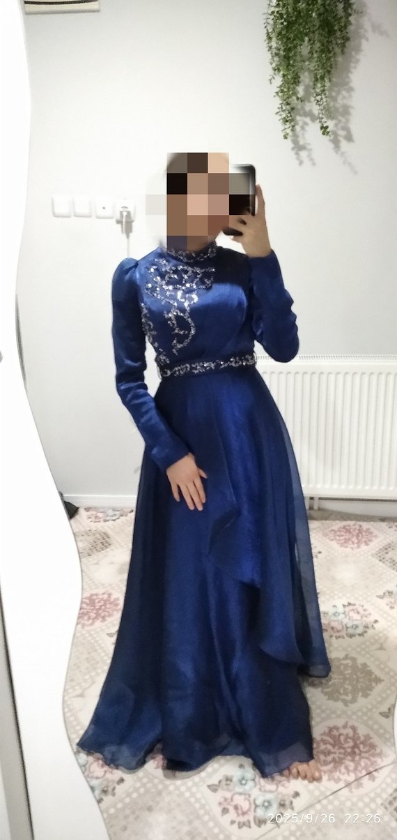 saks mavi taşlı janjan Abiye Elbise