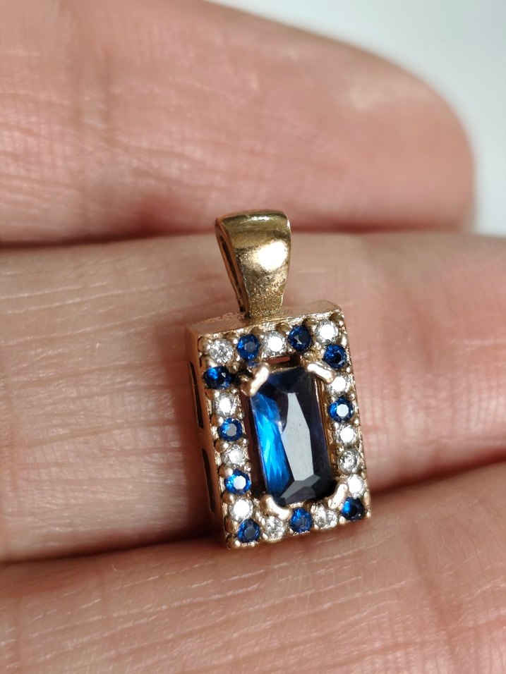 Koyu mavi taşın çevresinde parlak payetli taşlar bulunan vintage tarzda kadın kolye ucu. Günlük kullanıma uygun klasik şıklık sunar.