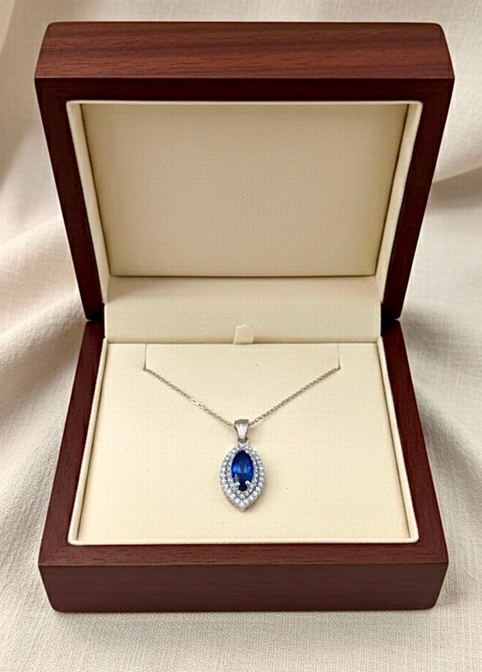 Modern klasik tarzda, zincir detaylı ve mavi taşlı normal uzunlukta midi kolye. Romantik akşamlar için uygun.