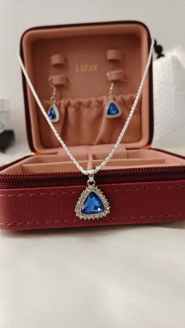 Mavi üçgen taşlarla süslenmiş, zincir detaylı kolye ve küpelerden oluşan takı seti, romantik akşamlar için bohem ve klasik şıklık sunar.