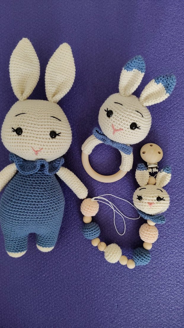 Pastel mavi renkli, tığ işi tavşan figürlü diş kaşıyıcı ve çıngırak seti. Yumuşak dokulu oyuncak, halka çıngırak ve boncuklu emzik klibi içerir.