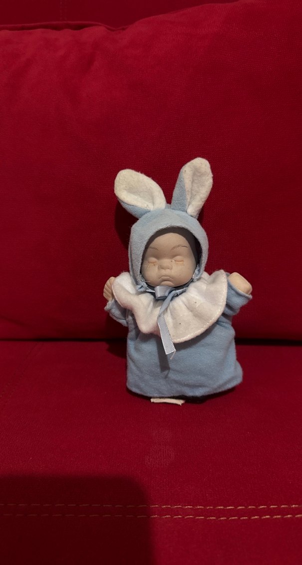 Bu bebek yumuşak mavi bir kıyafet, beyaz tavşan kulakları ve fiyonk detaylı beyaz bir yakaya sahip. Yüzü sakin ve uyuyor gibi görünüyor. Kurmalı müzikli # marka temsilidir