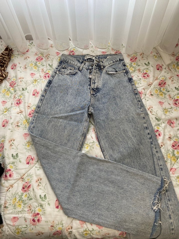 Mavi kot pantolon, bol kesim ve düğmeli detaylara sahip, günlük sokak stili için uygundur.