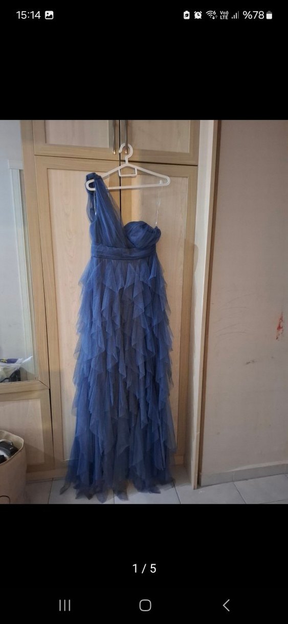 Mavi Tek Omuz Tüllü Abiye Elbise Yeni, Etiketli