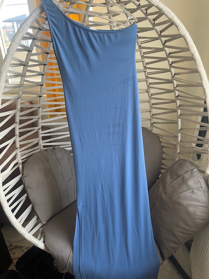 Mavi Tek Omuzlu Uzun Elbise iki yırtmaçlı