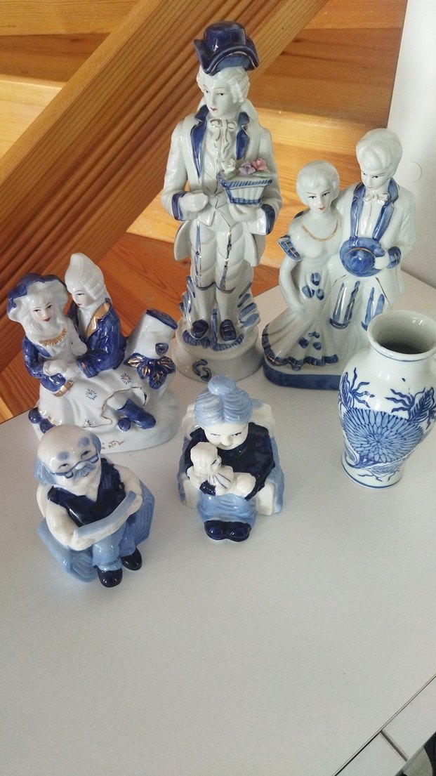 Koyu mavi ve beyaz renkte, farklı pozlardaki insan figürleri ve çiçek desenli dekoratif bir vazo içeren seramik figürin seti.son fotoda kız figürünün kolu kırılmıştır.