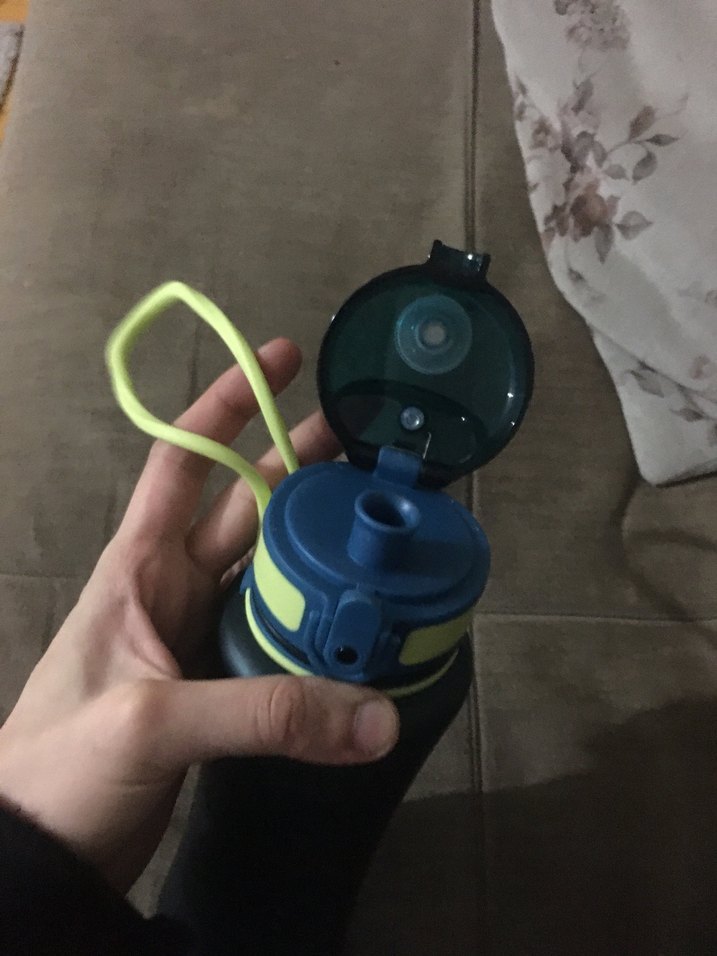 koyu mavi termos matara, açılır kapak ve taşıma için parlak kayış içerir. Sıcak veya soğuk içecekler için uygundur.