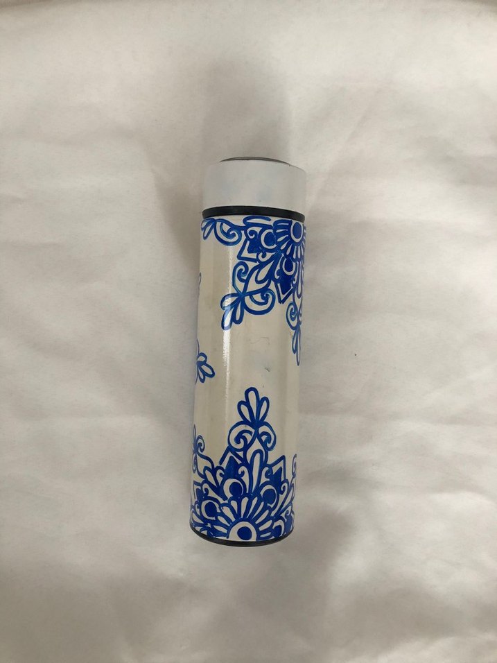 Renkli mavi termos şişe, içecekleri sıcak veya soğuk tutmak için çiçek desenli tasarıma sahiptir.