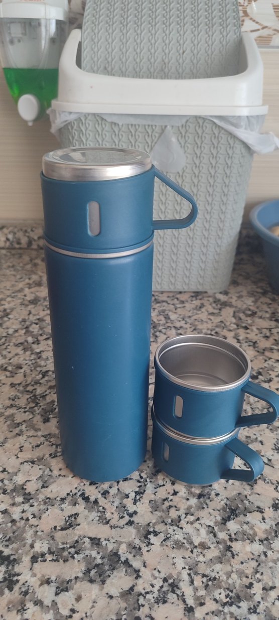 Mavi termos ve kulplu iki gri fincan içeren set, içecekleri sıcak veya soğuk tutan paslanmaz çelik iç yüzeye sahiptir. ☕ 4 saat sıcak soğuk tutma özelliği vardir.