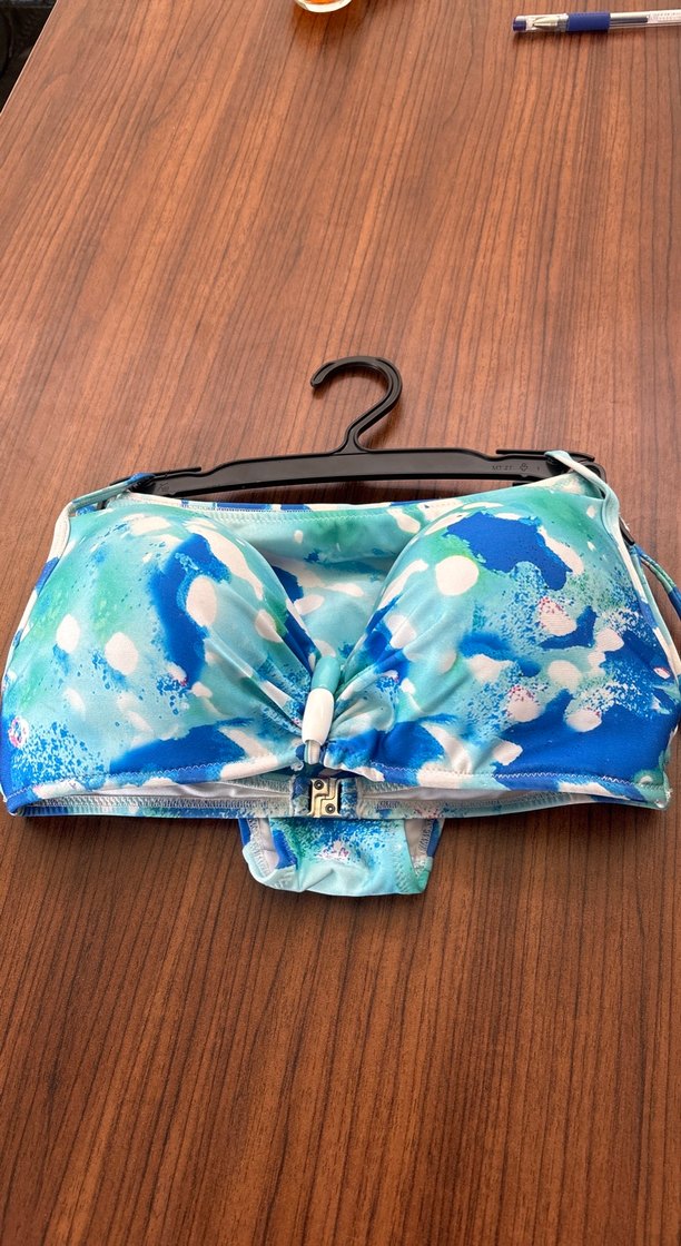 Pastel mavi tie-dye desenli, askılı ve tokalı, bohem tarzda, sıkı oturan bikini üstü. Plajda kullanıma uygun.