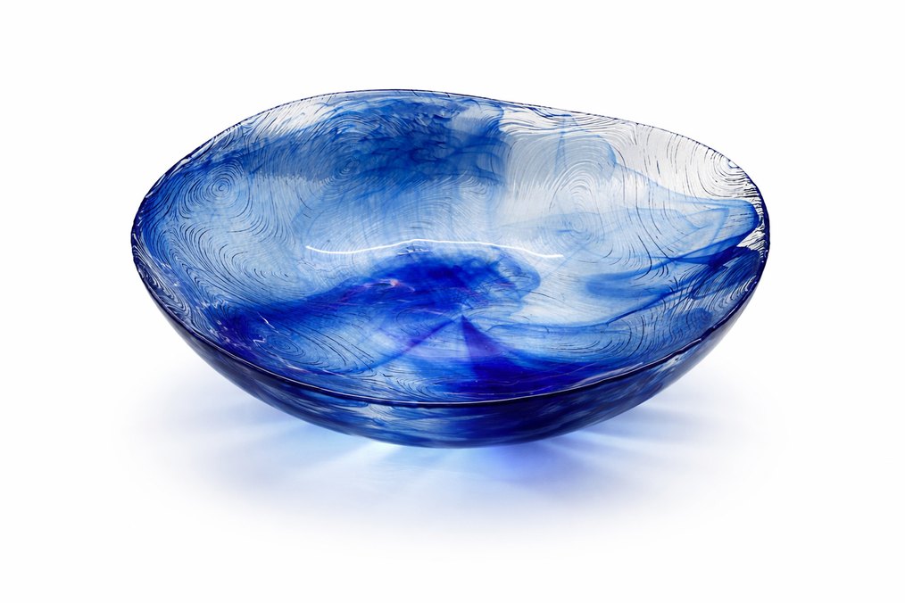 Renkli tie-dye desenli, mavi camdan yapılmış dekoratif ve sunum amaçlı cam kase. Sofranıza canlılık katmak için uygundur. Ölçü: 25x11cm