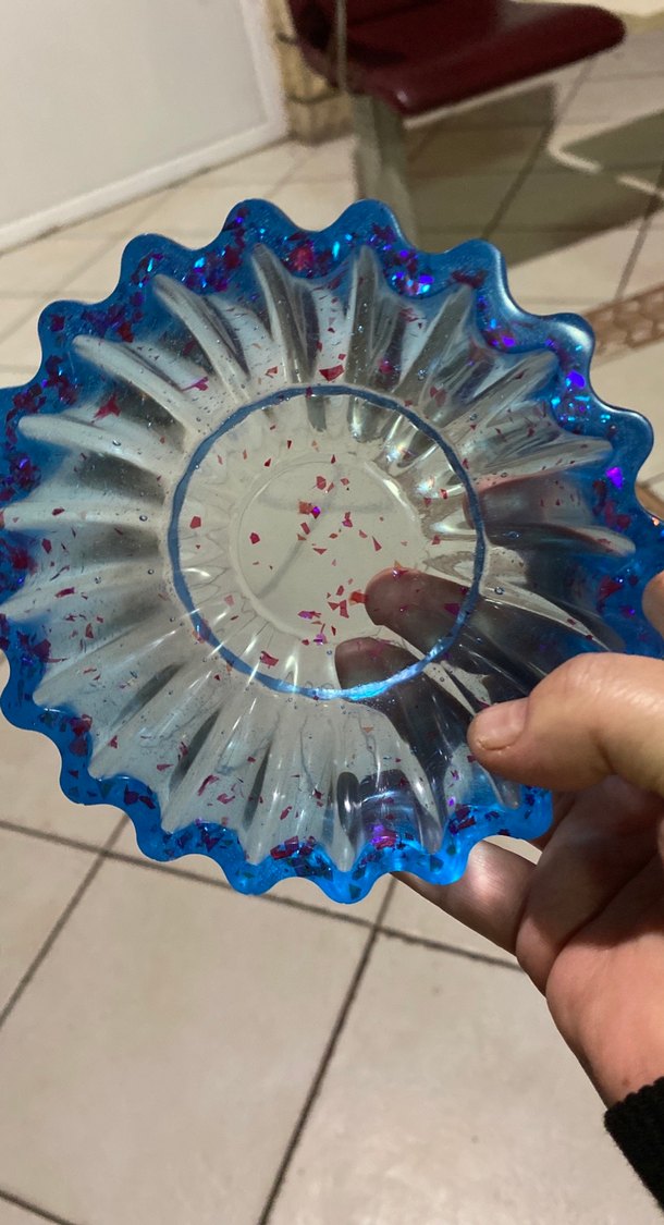 Dalgıç kenarlı, kırmızı lekeli tie-dye desenli renkli mavi cam tabak. ️Mavi hologram desenli reçine şeker kasesi el yapımı reçine epoksi