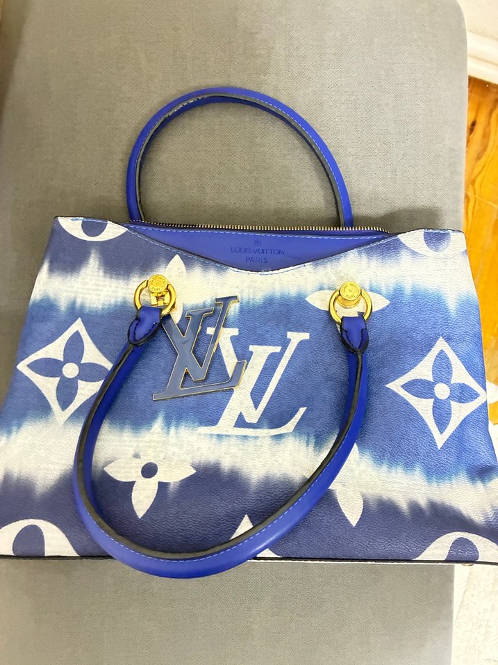 Mavi tie-dye desenli kadın omuz çantası, parlak sentetik kumaştan ve fermuarlı kapamalıdır. Bohem tarz ve Paris etkisiyle günlük kullanıma uygundur.
